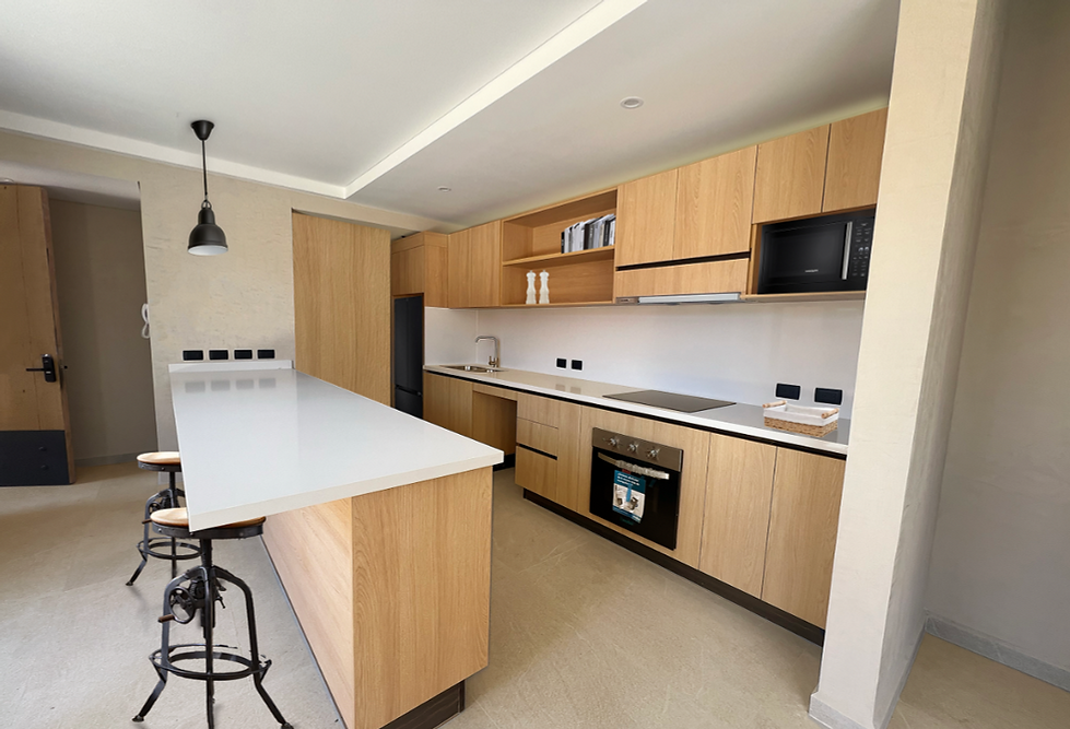 Cocina con cubierta de granito San Gabriel and muebles de encino. Parrilla eléctrica.